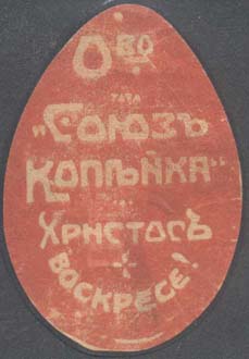 1915(?) г. Виньетка в форме яйца разм. 37 х 54 мм. Одноцветная печать на желтоватой бумаге. Пасхальное яйцо с текстом в пять строк: «О-во «Союз Копейки». Христос воскресе!».