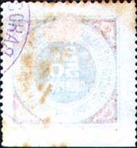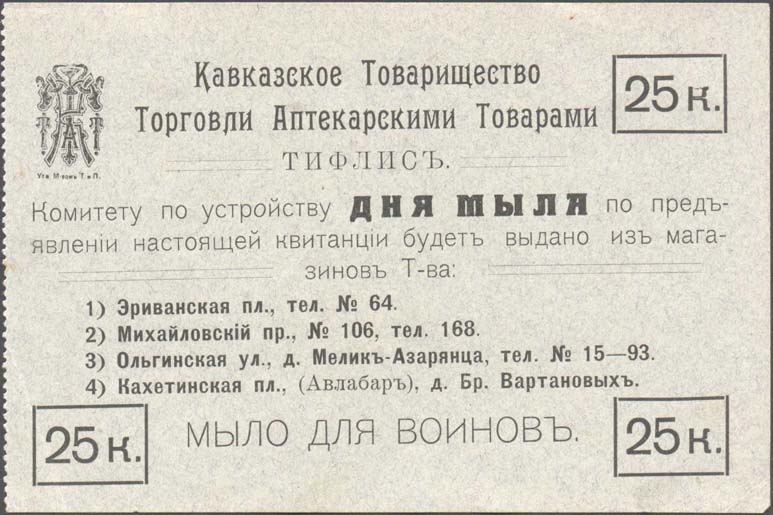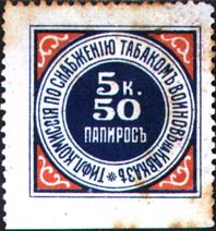 1915 г. Разм. рамки 26 х 26 мм. Двухцветная печать на белой бумаге. Зубц. 11 1/2. В центре в круглой рамке двойной номинал (в копейках и папиросах). По окружности текст: «Тифл[исская]. Комиссия по снабжению табаком воинов на Кавказе».