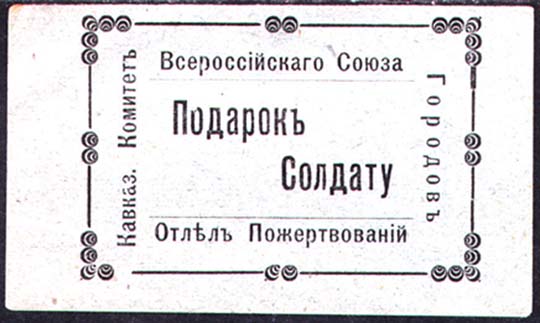 1915(?) г. Разм. ≈ 67 х 46 мм. Одноцветная печать на бумаге различных цветов. В декоративной рамке разм. ≈ 52 х 34 мм в центре текст в две строки: «Подарок Солдату». По периметру текст: «Кавказ[ский]. Комитет Всероссийского Союза Городов. Отдел Пожертвований».