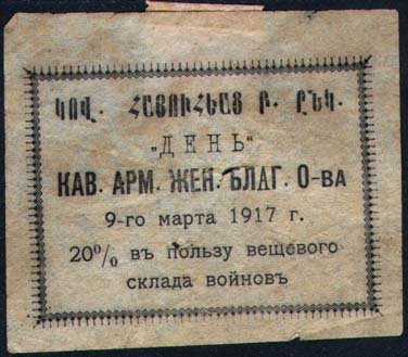 1917 г. 09.03.1917 г. Разм. рамки 54 х 41 мм. Одноцветная печать на тонкой желто-серой бумаге. В декоративной прямоугольной рамке сверху текст на армянском языке. В центре текст в две строки: ««День» Кав[казского]. Арм[янского]. Жен[ского]. Благо[отворительного]. О-ва». Ниже тест в три строки: «9-го марта 1917 г. 20% в пользу вещевого склада воинов».
