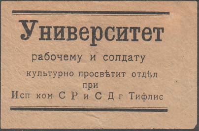 1917 г. Разм. 67 х 43 мм. Одноцветная печать на тонкой желтоватой бумаге. В центре между двумя горизонтальными полосами текст в пять строк: «Университет рабочему и солдату. Культурно просветит[ельный]. Отдел при Исп[олнительном]. Ком[итете]. СР и СД г. Тифлис».