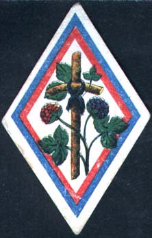 1915(?) г. Ромб разм. 36 х 57 мм. Многоцветная печать толстой белой бумаге. В рамке из ленты цветов российского флага в центре куст ежевики и крест из двух перекладин.