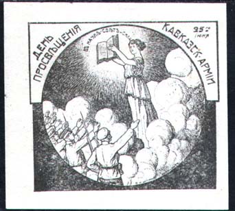 1917 г. 25.06.1917 г. Разм. рамки 46 х 42 мм. Одноцветная печать на белой бумаге. В центре в круглой рамке диаметром 40 мм аллегорический рисунок: женщина с книгой в облаках перед солдатами. Вокруг книги полукругом текст мелким шрифтом: «В науках свет и сила». Сверху над рамкой полукругом текст: «День просвещения Кавказской армии 25-го июня».