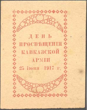 1917 г. 25.06.1917 г. Разм. 49 х 63 мм. Одноцветная печать на светло-желтой бумаге. В прямоугольной рамке из ромбиков в центре текст в пять строк: «День просвещения Кавказской армии 25 июня 1917 г». Сверху и снизу растительный орнамент.