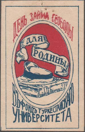 1917 г. Разм. 50 х 77 мм. Двухцветная печать на белой бумаге. В центре в прямоугольной рамке разм. 44 х 73 мм в двойной овальной рамке книга, фуражка гимназиста и лента. На ленте текст: «Для Родины». Сверху полукругом текст: «День займа свободы». Внизу текст в две строки: «В фонд Туркестанского университета».