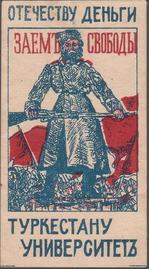 1917 г. Разм. 49 х 90 мм. Двухцветная печать на белой бумаге. В центре в прямоугольной рамке разм. 44 х 62 мм солдат с винтовкой на фоне демонстрации. Сверху текст: «Заем свободы». Сверху над рамкой текст: «Отечеству деньги». Внизу текст в две строки: «Туркестану университет».