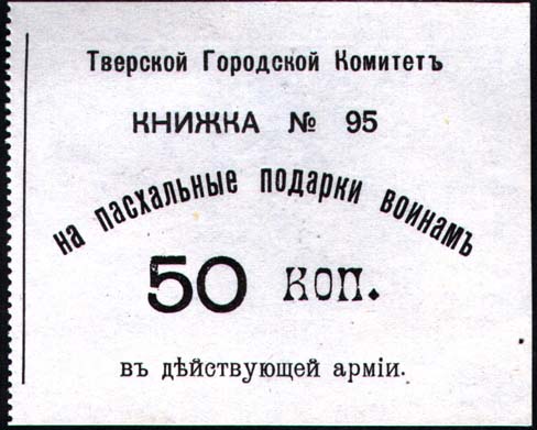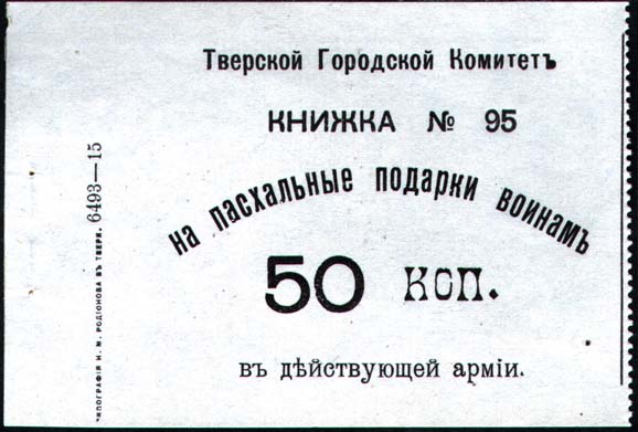 1915 г. Квитанция и корешок. Одноцветная печать на белой бумаге. На квитанции и корешке в ценре текст в пять строк: «Тверской Городской Комитет Книжка № ... На пасхальные подарки воинам 50 коп. в действующей армии».