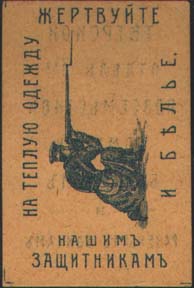 1916(?) г. Разм. 32 х 49 мм. Одноцветная двухсторонняя печать на бумаге различных цветов. На лицевой стороне в центре различные сюжеты. По перимет-ру текст: «Жертвуйте на теплую одежду и белье нашим защитникам». На оборотной стороне текст в семь строк: «Тверской отдел О-ва Повсеместной Помощи Больным и Раненым Воинам».