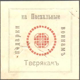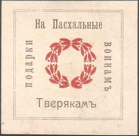 1915(?) г. Разм. 47 х 47 мм. Двухцветная печать на белой бумаге. В двойной прямоугольной рамке разм. 37,5 х 37,5 мм в центре орнамент. По периметру с внутренней стороны рамки текст: «На пасхальные подарки воинам Тверякам».