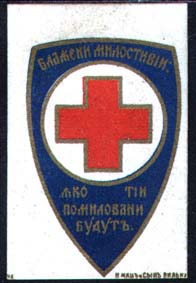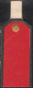 1915 г. Виньетки в виде погон разм. 39 х 18 мм. Трехцветная печать с тиснением на толстой белой бумаге. Сверху прямоугольник для крепления знака к одежде булавкой. Сбор в пользу раненых воинов.