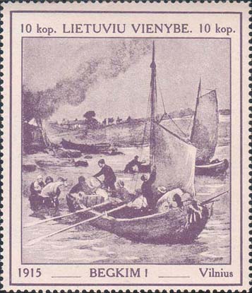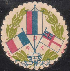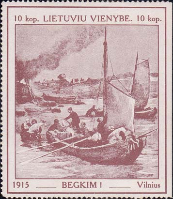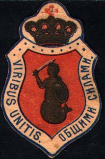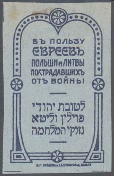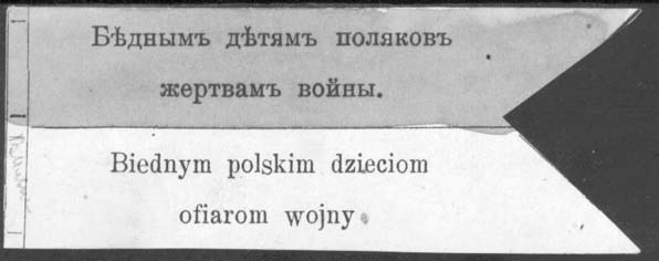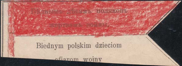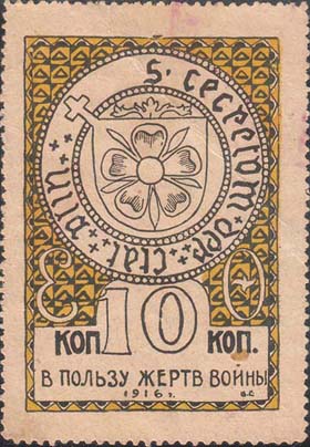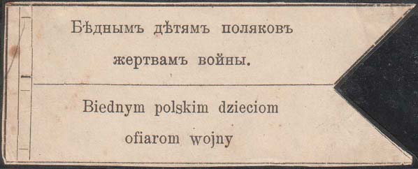 1915(?) г. Виньетка в виде щитка сложной формы разм. 35 х 55 мм. Трехцветная печать на толстой белой бумаге. В центре герб Варшавы. Сверху королевская корона. По периметру щитка справа текст на руссом языке: «Общими силами». Слева тот же текст на латинском языке: «Viribus unitis».