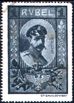 0 г. 1917 Разм. рамки 41 х 61 мм. Одноцветная печать на бумаге различных цветов. В центре в декоративной рамке портрет Ю. Пилсудского в военной форме. Справа от портрета вертикально снизу вверх текст на польском языке: «Ю. Пилсудский». Внизу одноглавый орел, скрещенные мечи и дубовые ветки. Сверху номинал. Внизу под рамкой выходные данные мелким шрифтом на польском языке: «Ст. Савичевский».