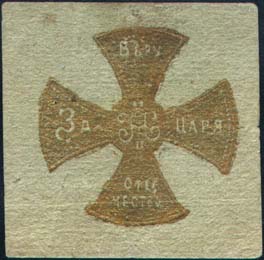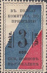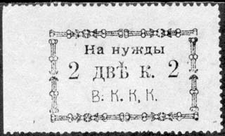 1915 г. Разм. рамки 37 х 23 мм. Одноцветная печать на тонкой бумаге различных цветов. Зубц. 11 1/2 и Б.З. В прямоугольной декоративной рамке в цен-тре номинал. Сверху текст: «На нужды». Внизу продолжение текста: «В.К.К.К.».