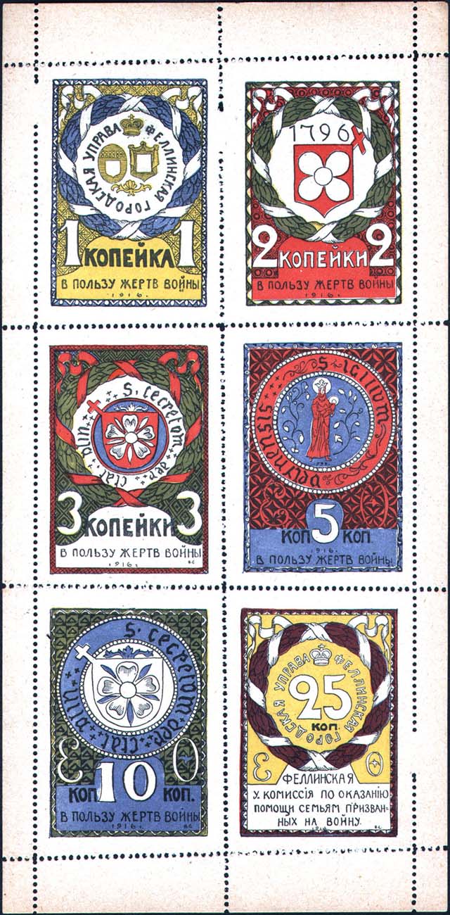 Печать городской управы Феллина. По окружности текст: «Феллинская Городская Управа». Ниже но-минал и текст: «В пользу жертв войны». Ниже мелким шрифтом дата: «1916» и буквы: «В.С.».