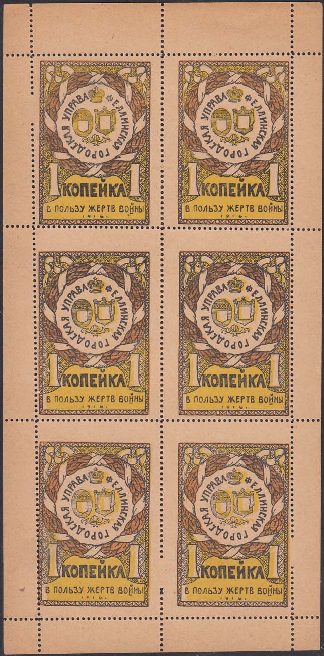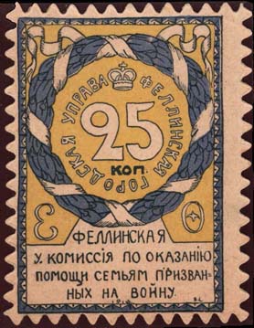 Номинал в центре венка. По окружности текст: «Феллинская Городская управа». Ниже текст в четыре строки: «Феллинская У[ездная]. Комиссия по оказанию помощи семьям призванных на войну». Ниже мелким шрифтом дата: «1916» и буквы: «В.С.».