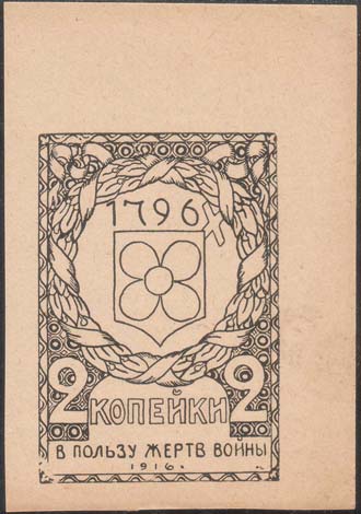 Печать с 4-х лепестковым цветком и дата: «1796» в центре венка. Ниже номинал и текст: «В пользу жертв войны». Ниже мелким шрифтом дата: «1916» и буквы: «В.С.».