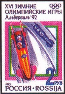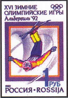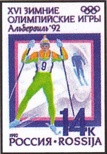 1992 г. 10 января. XVI зимние олимпийские игры (Франция, Альбервиль, 8-24.02) Разм. 26 x 37 мм. Многоцветная глубокая печать. Перф. рам. 11 1/2 х 12.