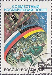 1992 г. 17 марта. Совместный российско-германский космический полет (17 - 25 марта). Разм. 28 x 40 мм. Многоцветная офсетная печать на белой мелованной бумаге. Зубц. греб. 12 х 12 1/2.