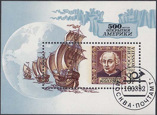 1992 г. 18 марта. 500-летие открытия Америки. Почтовый блок. Разм. блока 90 х 65 мм. Многоцветная глубокая печать на белой мелованной бумаге. Зубц. рам. 12 х 11 1/2.