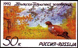 1992 г. 12 марта. Приокско-Террасный заповедник. Разм. 40 х 28 мм. Многоцветная офсетная печать на белой мелованной бумаге. Зубц. 12 х 12 1/2.