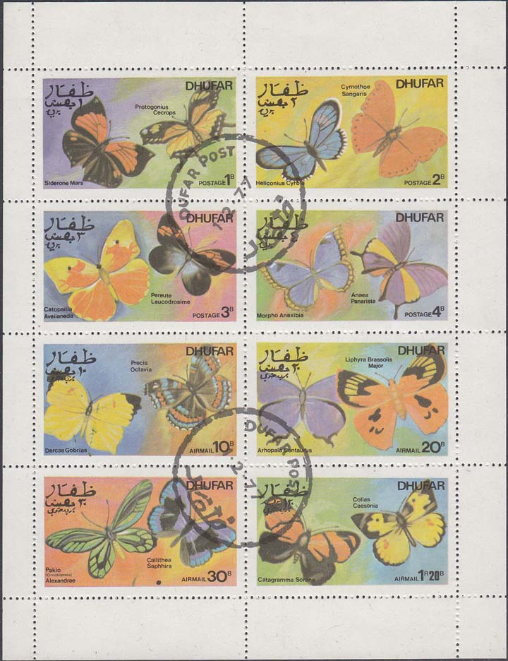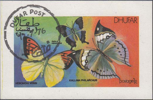 1977 г. Разм. рис. 46 х 27 мм. Многоцветная печать на белой глянцевой бумаге. Зубц. 14. В центре изображения бабочек различных видов. По периметру номинал и различные тексты на арабском и английском языках.