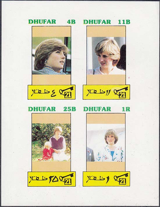 1985(?) г. Разм. рис. 27 х 43 мм. Многоцветная печать на белой глянцевой бумаге. С клеем. В центре Принцесса Диана.