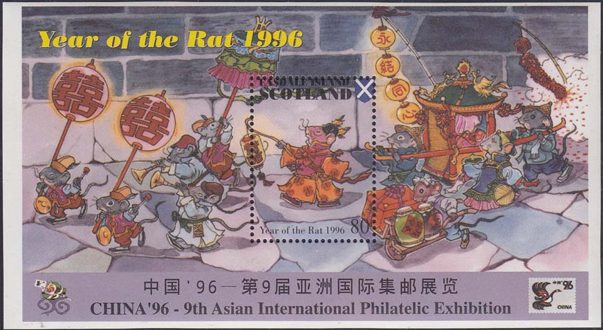 1996 г. Блок разм. 148 х 80 мм. Многоцветная печать на белой глянцевой бумаге. Зубц. 12 1/2. С клеем. В центре крыса. По периметру номинал и тексты на английском языке. На полях блока продолжение рисунка и тексты на английском языке.
