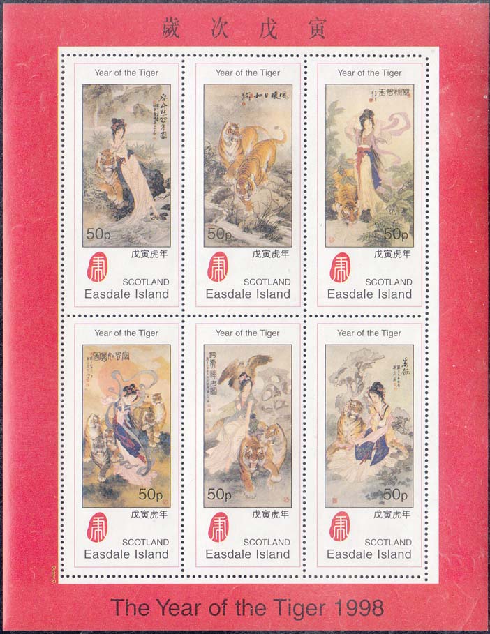 1998 г. Разм. по перфорации 29 х 64 мм. Многоцветная печать на белой глянцевой бумаге. Зубц. 14 1/2. С клеем. В центре репродукции картин китайских художников. В правом нижнем углу номинал. Сверху и снизу тексты на английском и китайском языках.