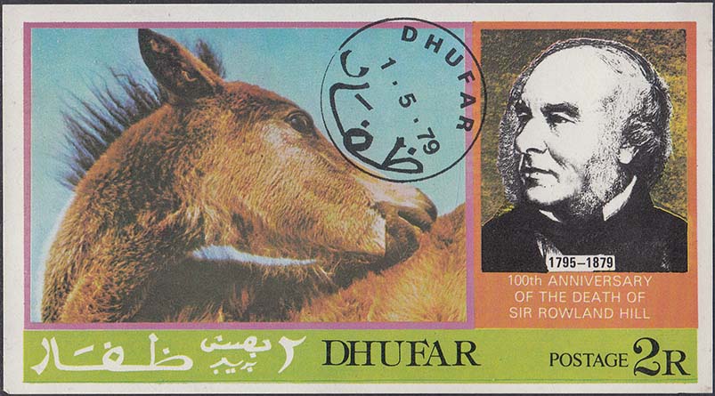1979 г. Листок разм. рис. 126 х 69 мм. Слева лошадь. Справа портрет Р. Хилла и текст на английском языке. Внизу название страны и номинал.