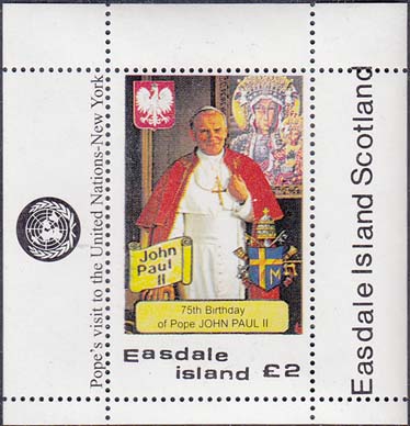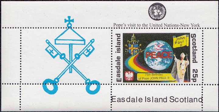 1975 г. Блок разм. 63 х 64 мм. Многоцветная печать на белой глянцевой бумаге. Зубц. 14. С клеем. В центре на марке Папа Иоан Павел II. внизу название территории на английском языке и номинал. По периметру тексты на английском языке.