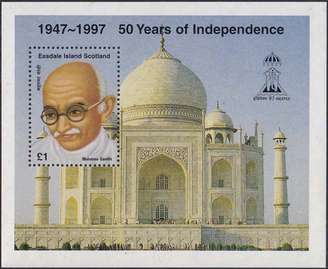 1997 г. Блок разм. 110 х 91 мм. Многоцветная печать на белой глянцевой бумаге. Зубц. 12 1/2. С клеем. На марке портреты индийских политических деятелей. По периметру номинал и тексты на английском и хинди. На полях блока Тадж-Махал и текст на английском языке: "1947-1997 50 лет независимости".