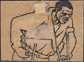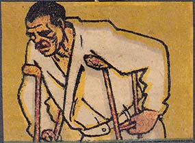 1916(?) г. Разм. 48 х 36 мм. Трехцветная печать на светло-серой бумаге. В центре человек в больничном халате на костылях.