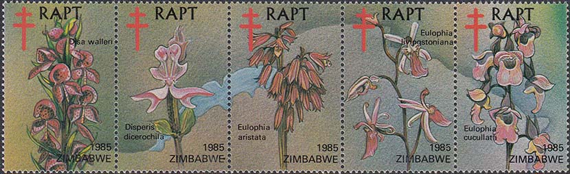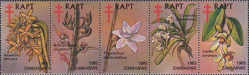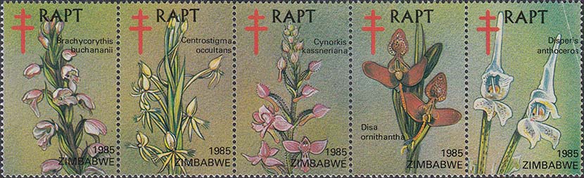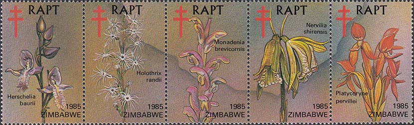 1985 г. Разм. по перфорации 29 х 42 мм. Многоцветная печать на белой бумаге. Зубц. 14 1/4. С клеем. В центре изображения различных растений и их название на латыни. Сверху аббревиатура на английском языке "RAPT". Внизу дата и название государства.