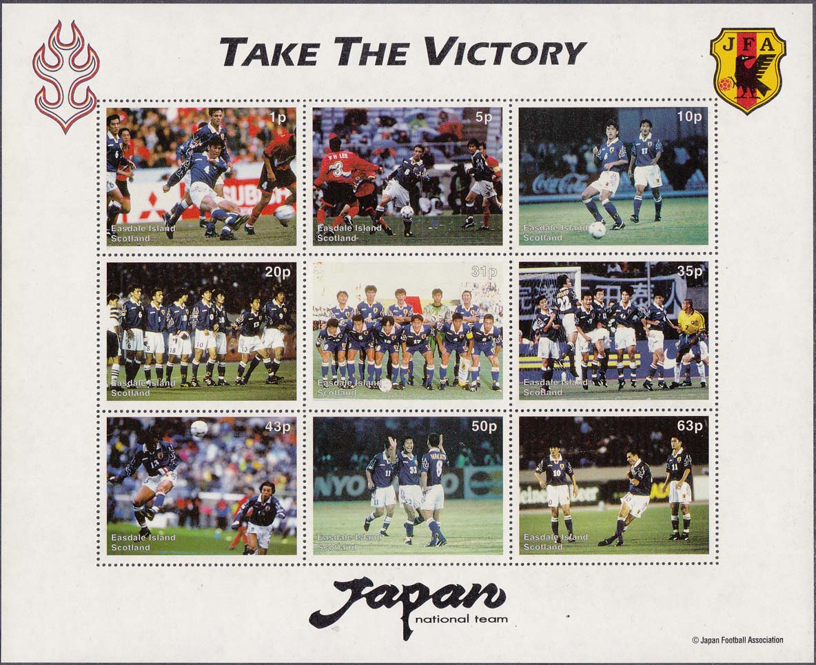 1980(?) г. Разм. рис. 47 х 34 мм. Многоцветная печать на белой бумаге. Зубц. 13 3/4. С клеем. В центре различные сцены игры в футбол. В правом верхнем углу номинал. В левом нижнем углу текст на английском языке: "Eastdale Island Scotland".