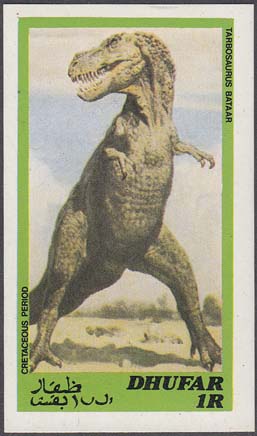 1980 г. Разм. 43 х 73 мм. Многоцветная печать на белой глянцевой бумаге. В ценре в прямоугольной рамке Тиранозавр. Внизу название страны на английском и арабском языках и номинал.