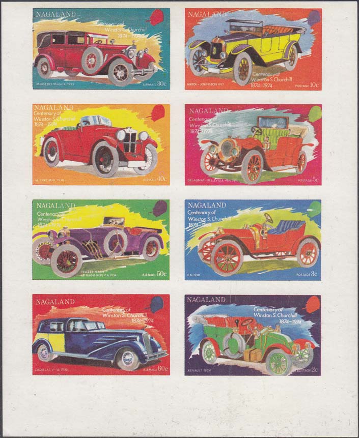 1974 г. Разм. рис. 46 х 27 мм. Многоцветная печать на белой бумаге. Зцбц. 14 и Б.З. В центре автомобили различных марок и тексты на английском языке.