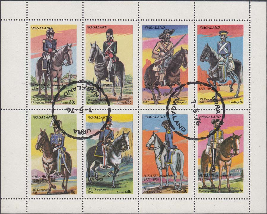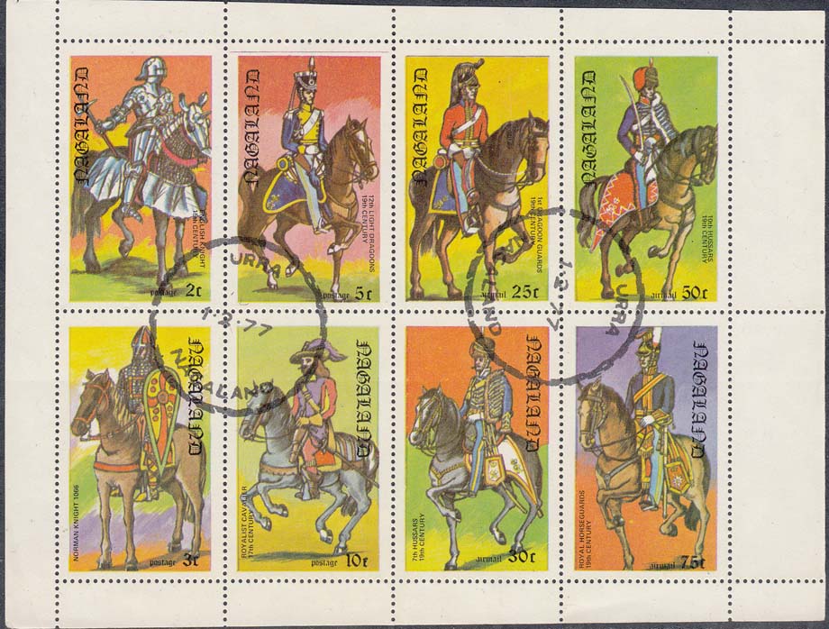 1977 г. Разм. рис. 26 х 46 мм. Многоцветная печать на белой глянцевой бумаге. Зубц. 14 1/4. В центре всадники в военной форме на лошадях. По периметру пояснительная подпись, название территории на английском языке и номинал.