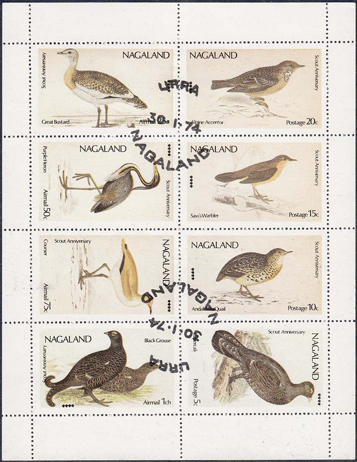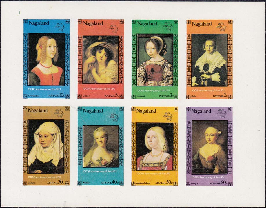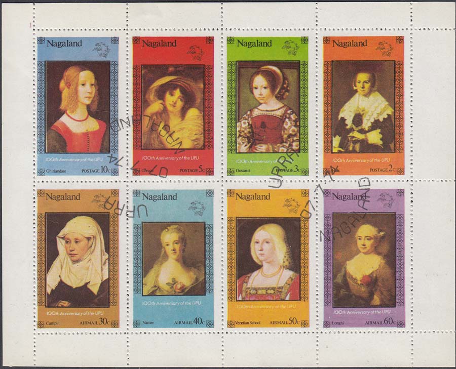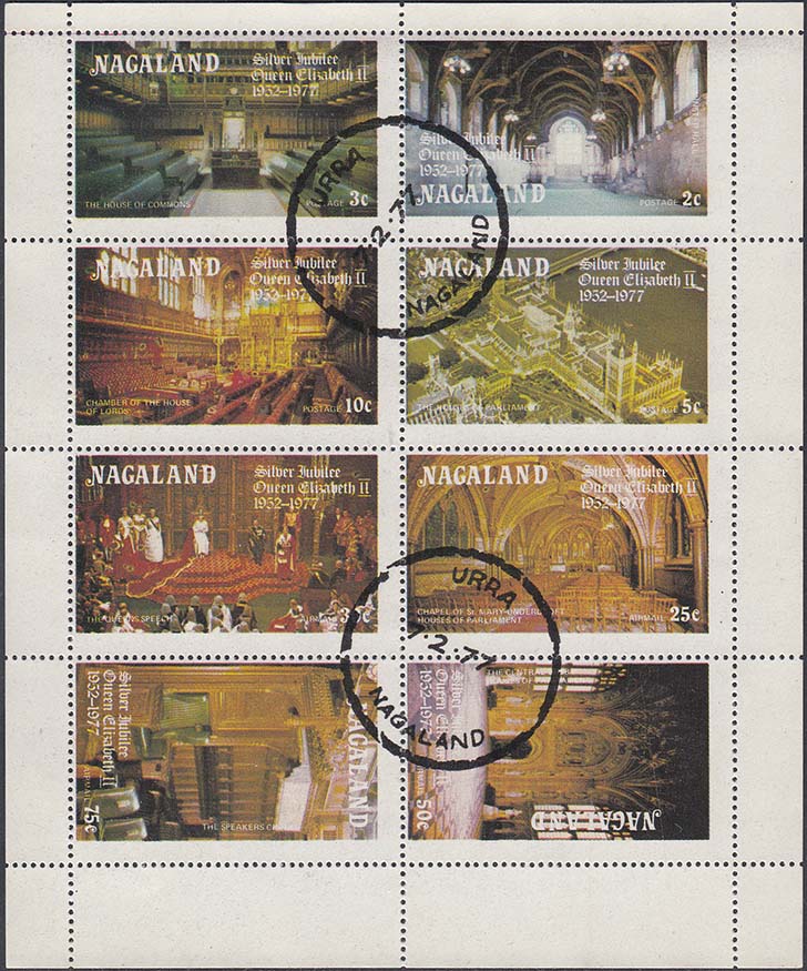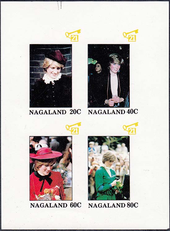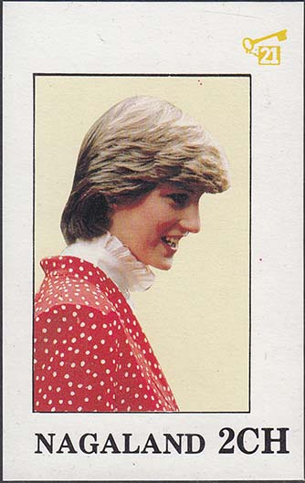 1980(?) г. Разм. рис. 23 х 35 мм. Многоцветная печать на белой глянцевой бумаге. В центре портреты Принцессы Дианы. Внизу текст на английском языке: "Нагаленд" и номинал.