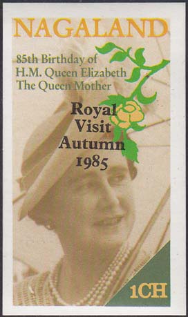 1980(?) г. Разм. 56 х 90 мм. Многоцветная печать на белой глянцевой бумаге. В центре портрет Принцессы Дианы в профиль. Внизу текст на английском языке: "NAgaland" и номинал.