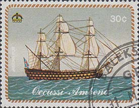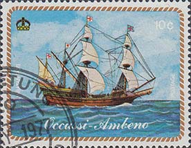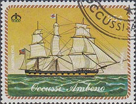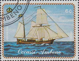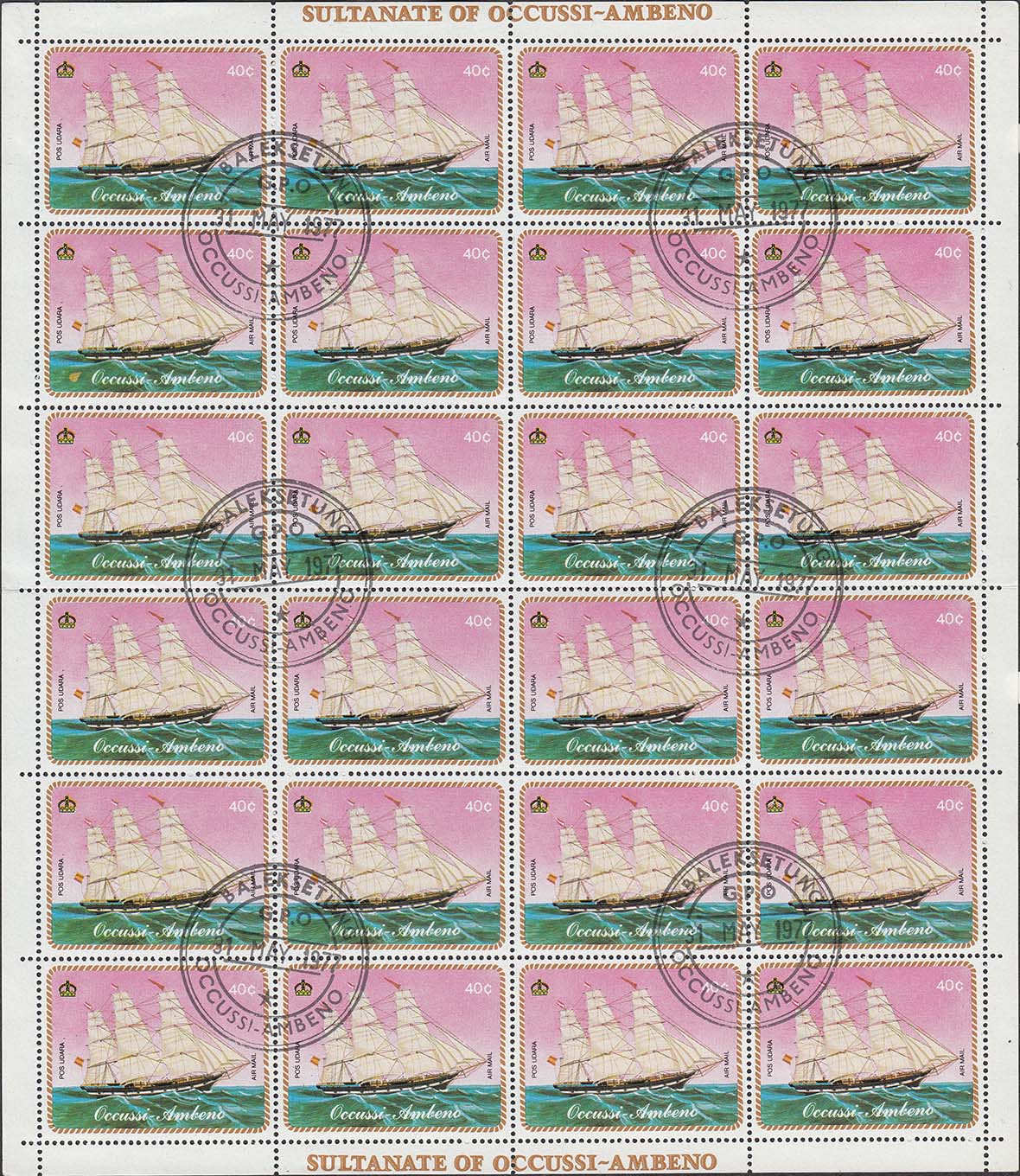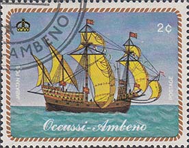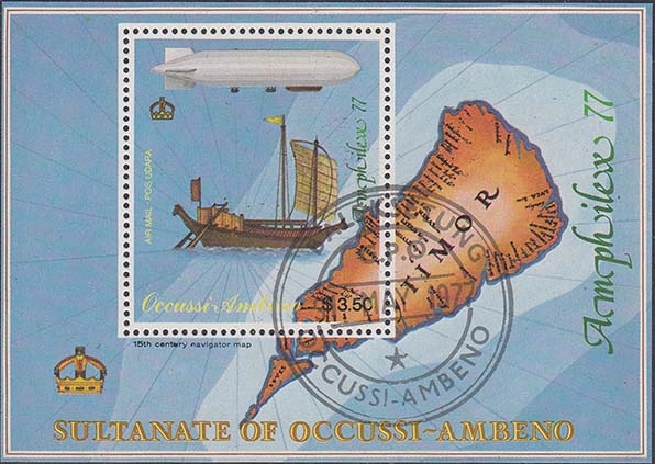 1977 г. Блок разм. рамки 99 х 69 мм. Многоцветная печать на белой глянцевой бумаге. Зубц. 13 1/4. В центре на фоне карты с островом Тимор парусный корабль и дирижабль. На полях блока продолжение карты.