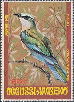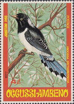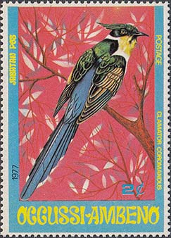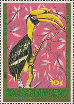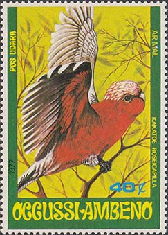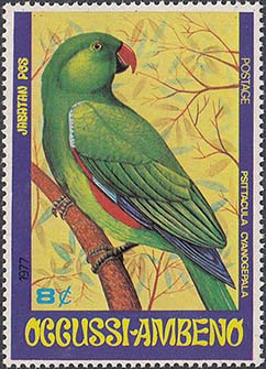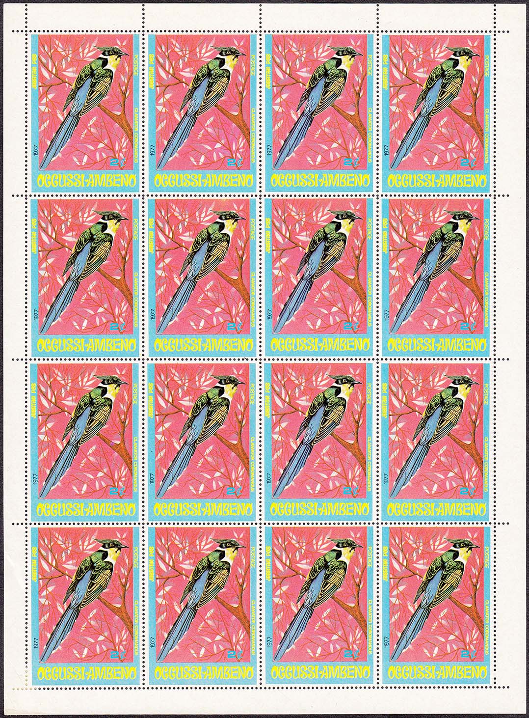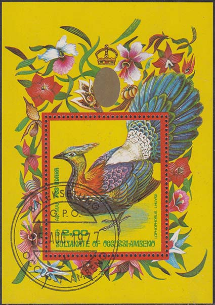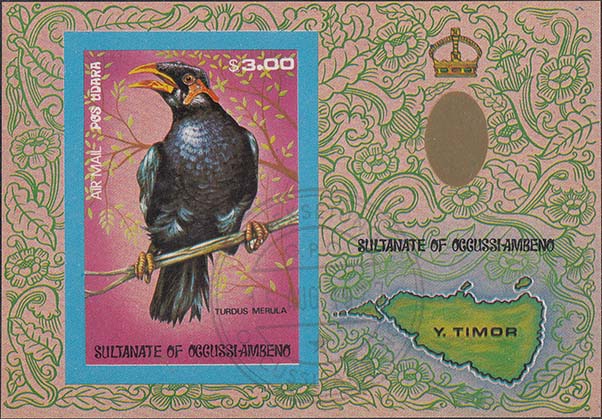 1977 г. Блок разм. 102 х 71. Многоцветная печать на белой бумаге. В центре птица на ветке. Номинал и тексты на английском языке. На полях блока растительный орнамент и карта острова Тимор.