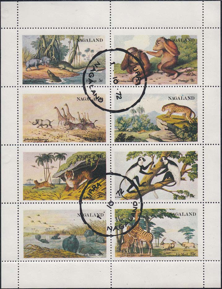 1974 г. Разм. рис. 46 х 27 мм. Многоцветная печать на белой глянцевой бумаге. Зубц. 14 1/4. В центре различные рисунки с животными Африки. Название страны на английском языке и номинал.