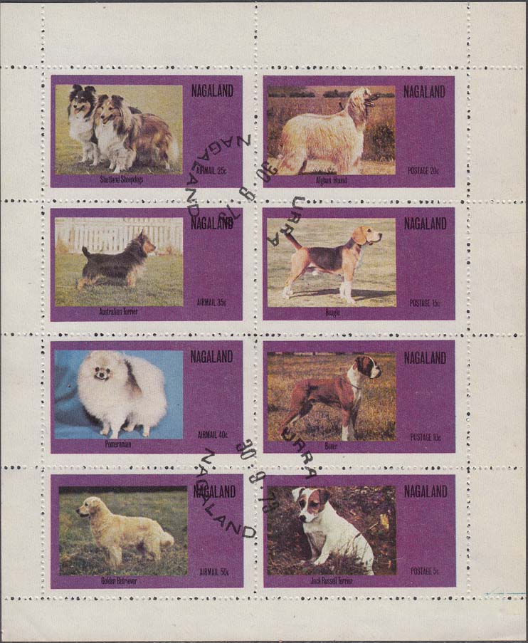 1973 г. Разм. рис. 46 х 27 мм. Многоцветная печать на белой глянцевой бумаге. Зубц. 14 1/4. В центре на сплошном фоне изображение собак различных пород и пояснительная подпись на английском языке. Название страны на английском языке и номинал.