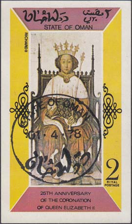 1976 г. Разм. 45 х 76 мм. Многоцветная печать на белой глянцевой бумаге. В центре картина, изображающая королеву на троне. Название страны на английском и арабском языках. Справа внизу номинал.