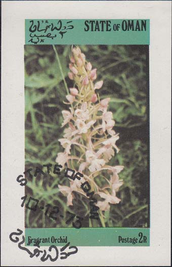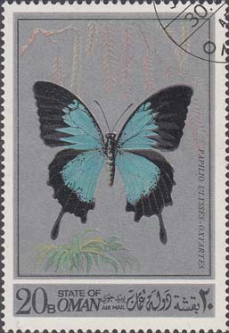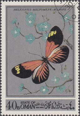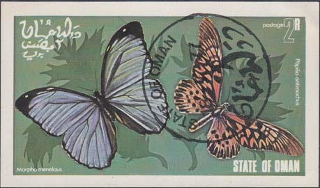 1977 г. Разм. 76 Х 45 мм. Многоцветная печать на белой глянцевой бумаге. В центре две бабочки. Название страны на английском и арабском языках. Справа сверху номинал.