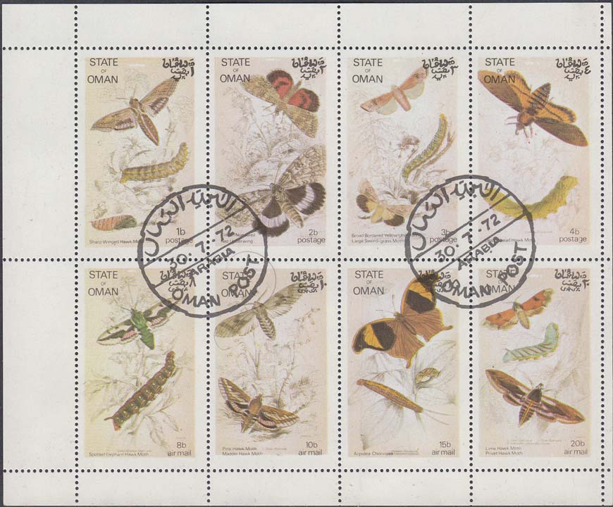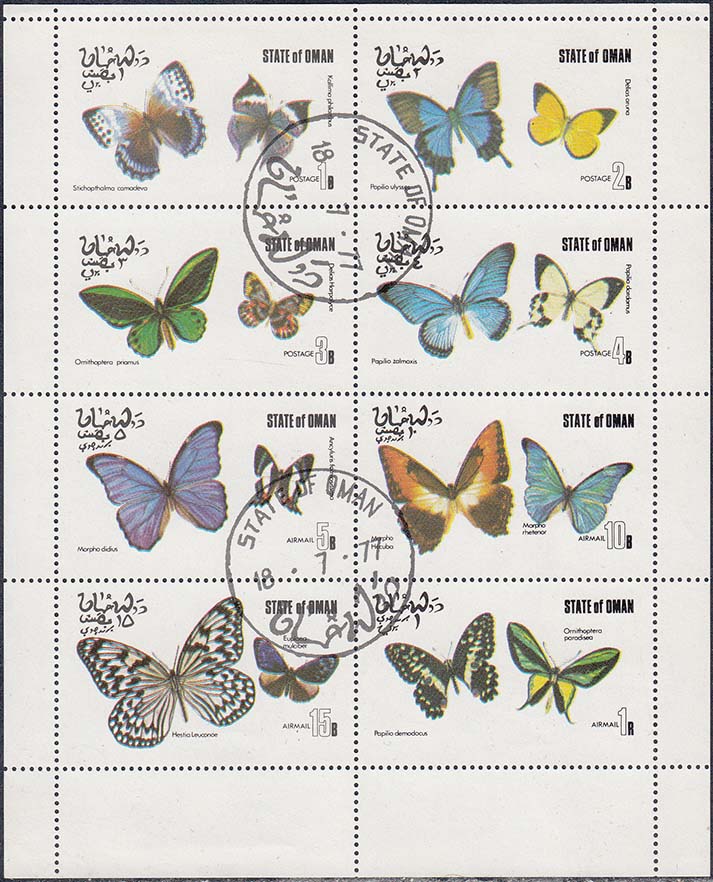1977 г. Разм. по перфорации 51 х 32 мм. Многоцветная печать на белой глянцевой бумаге. Зубц. 14. В центре бабочки различных видов. Тексты на английском и арабском языке и номинал.