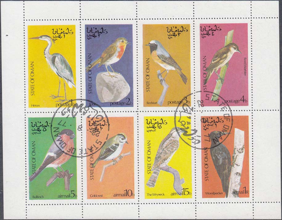 1977 г. Разм. рис. 26 х 45 мм. Многоцветная печать на белой глянцевой бумаге. Зубц. 14 1/4. В центре на сплошном фоне изображение птиц различных видов. Тексты на английском и арабском языке и номинал.