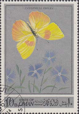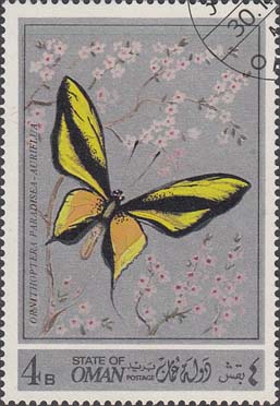 1972 г. Разм. рис. 38 х 58 мм. Многоцветная печать на белой бумаге. Зубц. 12 3/4. В прямоугольной рамке в центре на сплошном фоне изображение бабочек различных видов с пояснительным текстом. Внизу название страны на английском и арабском языках и номинал.