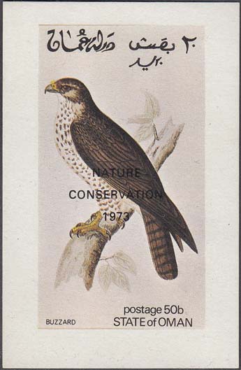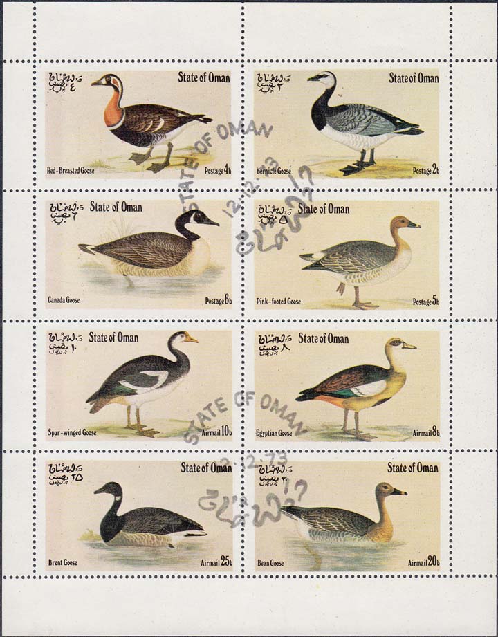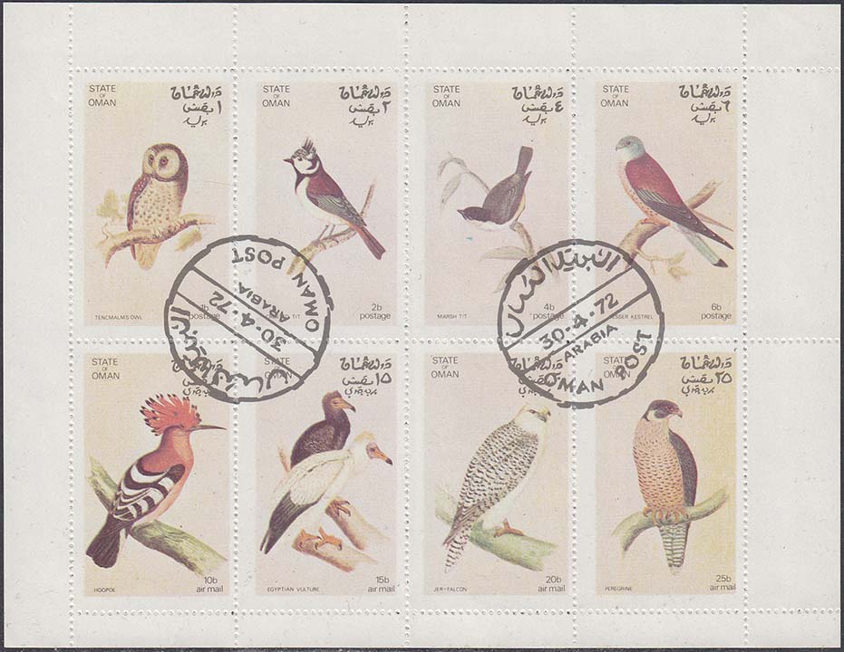 1972 г. Разм. рис. 27 х 45 мм. Многоцветная печать на белой глянцевой бумаге. Зубц. 14 1/4 низкого качества. В центре на сплошном фоне птицы различных видов, номинал и тексты на английском и арабском языках.