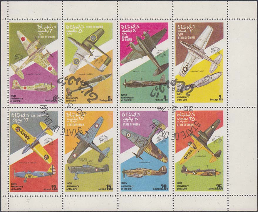 1974 г. Разм. рис. 27 х 46 мм. Многоцветная печать на белой глянцевой бумаге. Зубц. 13 1/4. В центре на сплошном фоне самолеты различных моделей. Тексты на английском и арабском языке и номинал.